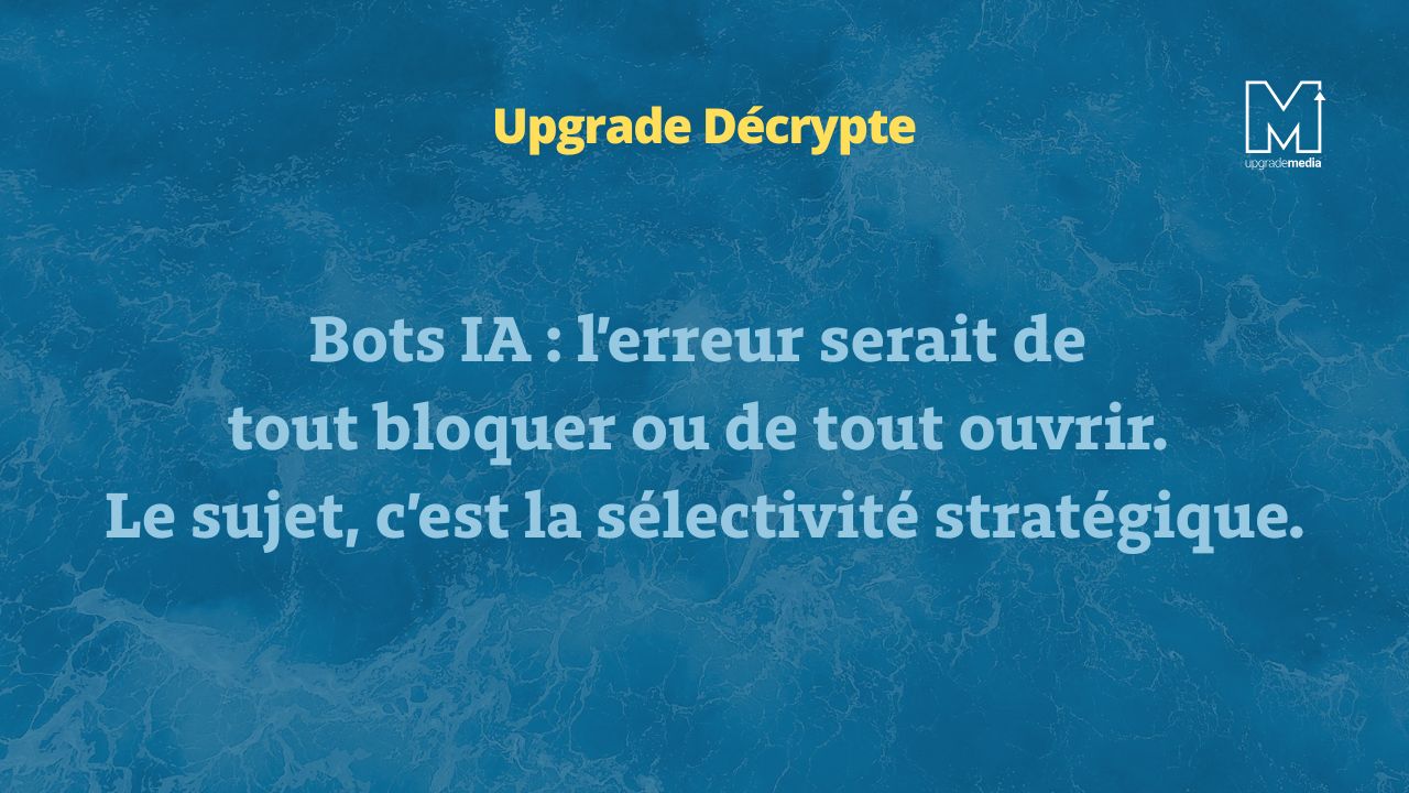 L’erreur serait de tout bloquer ou de tout ouvrir. Le sujet, c’est la sélectivité stratégique. Quels contenus ont une vraie valeur pour les IA ? « Vous pouvez mesurer cela gratuitement », rappelle Hopperton. Identifier ses assets différenciants devient la clé. En les protégeant, les médias se redonnent un pouvoir de négociation. C’est cette granularité — ce ciblage éditorial et économique — qui permet de reprendre la main sur la chaîne de valeur IA.